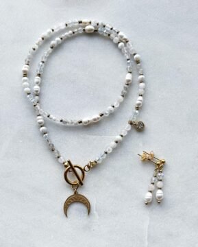 Naszyjnik z kamieniem księżycowym, hematytem, kryształem górskim, perłami, labradorytem i mieniącymi się kryształkami.