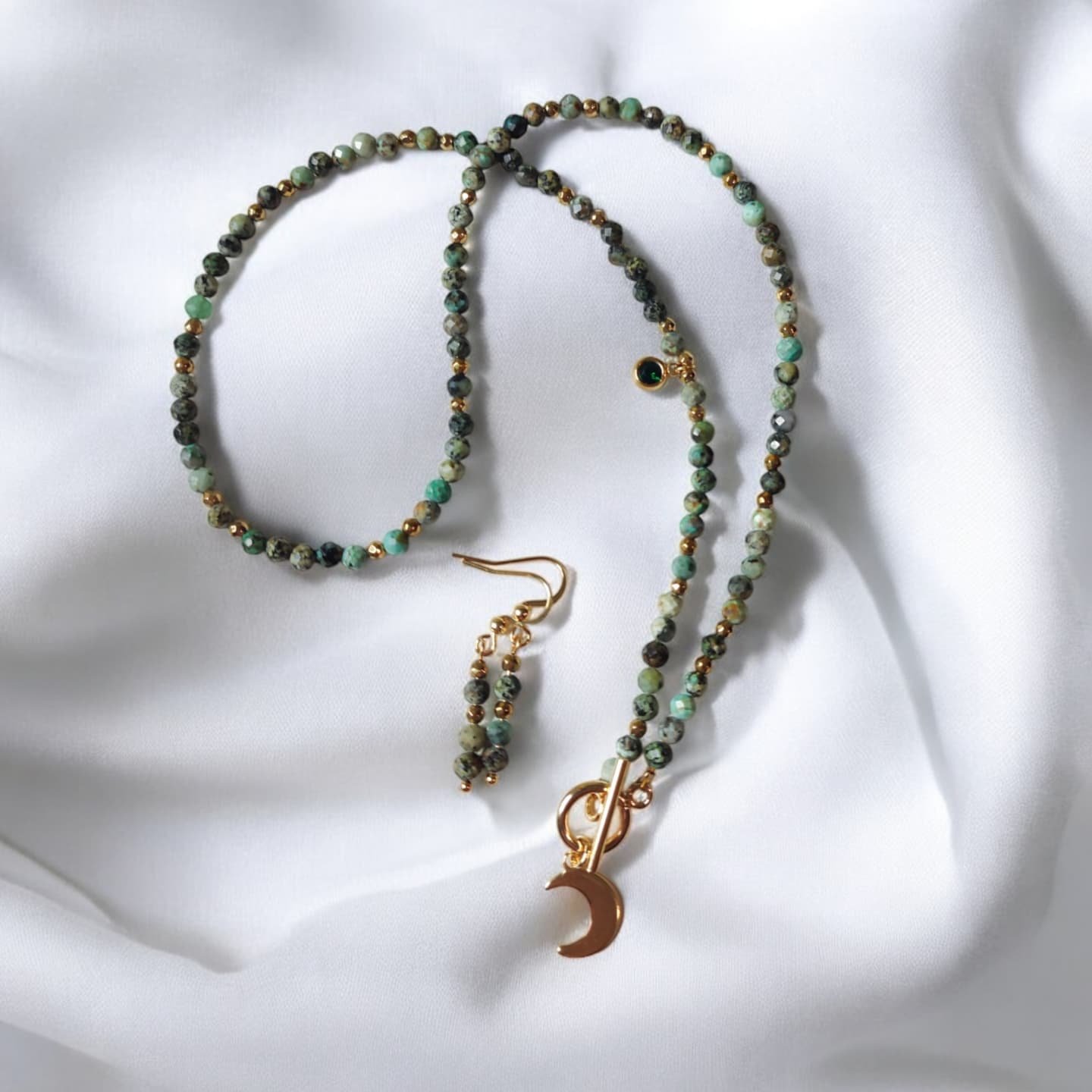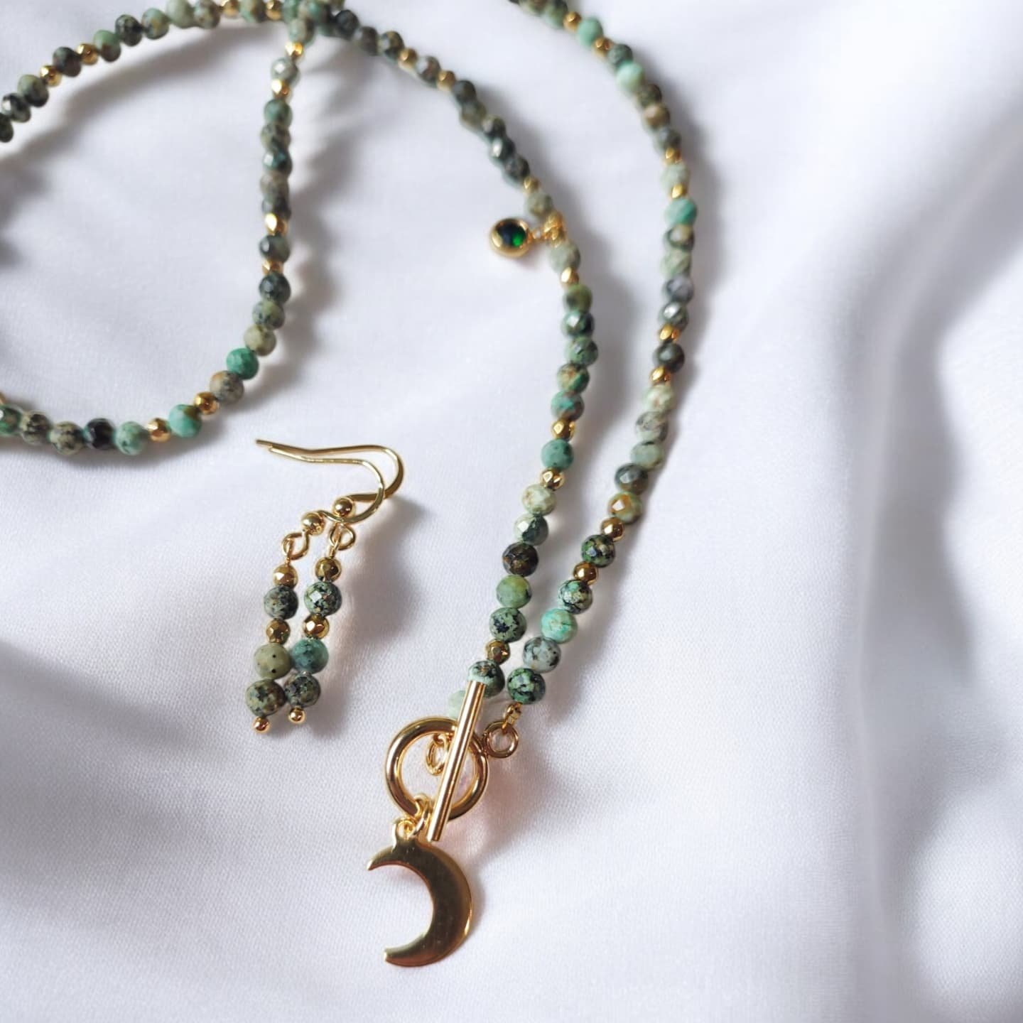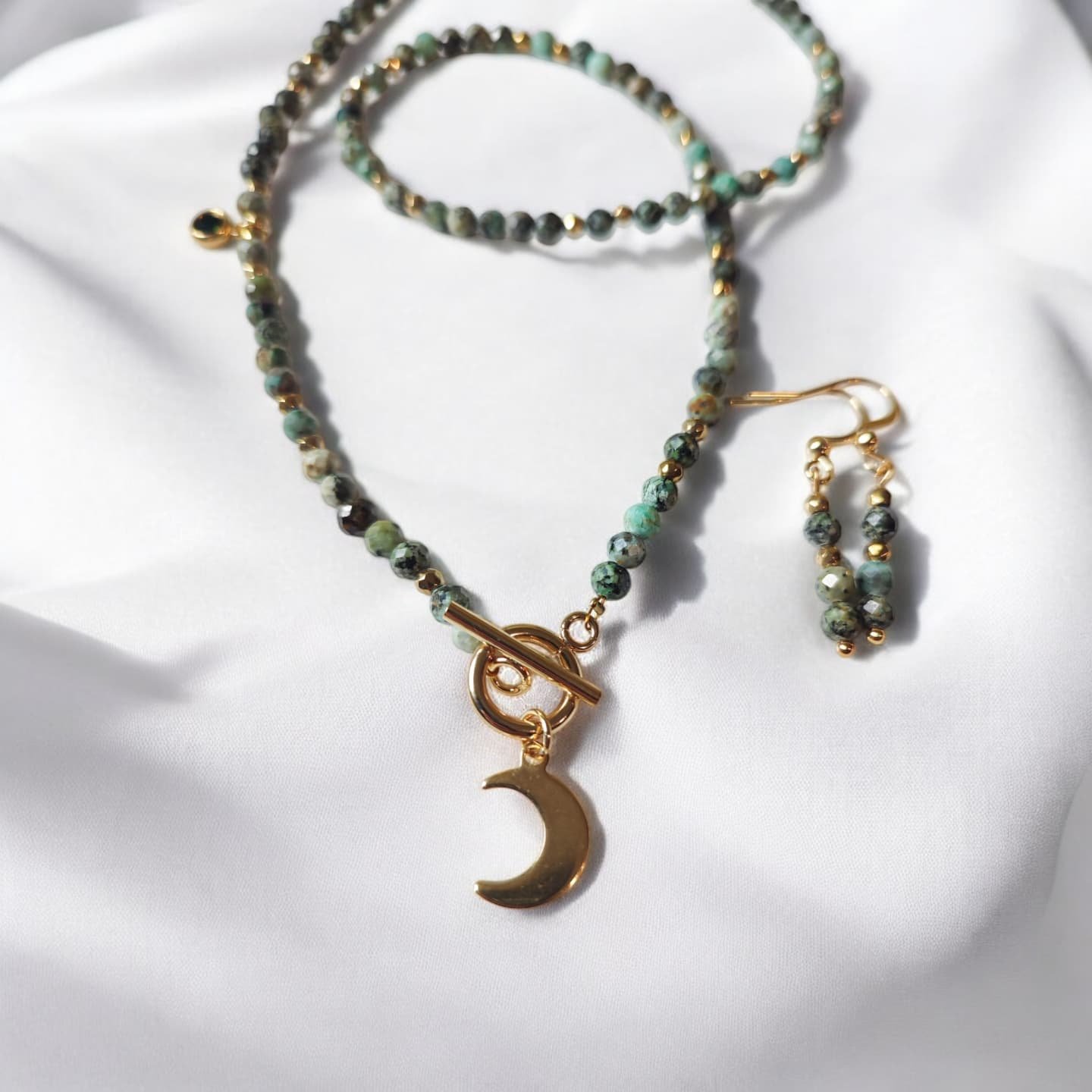 Połączenie jaspisu afrykańskiego z hematytem i zawieszką w kształcie księżyca tworzy niepowtarzalny, naturalny talizman.