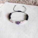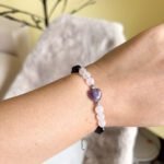 Ametyst (świadomość, ochrona) + kwarc różowy (serce, miłość) tworzą zestaw równoważący umysł i uczucia: pomagają zachować spokój ducha, otwierając jednocześnie na empatię i życzliwość.