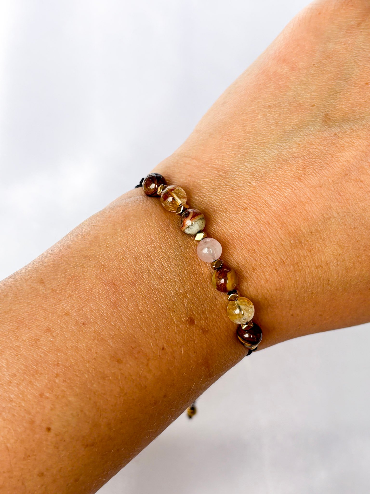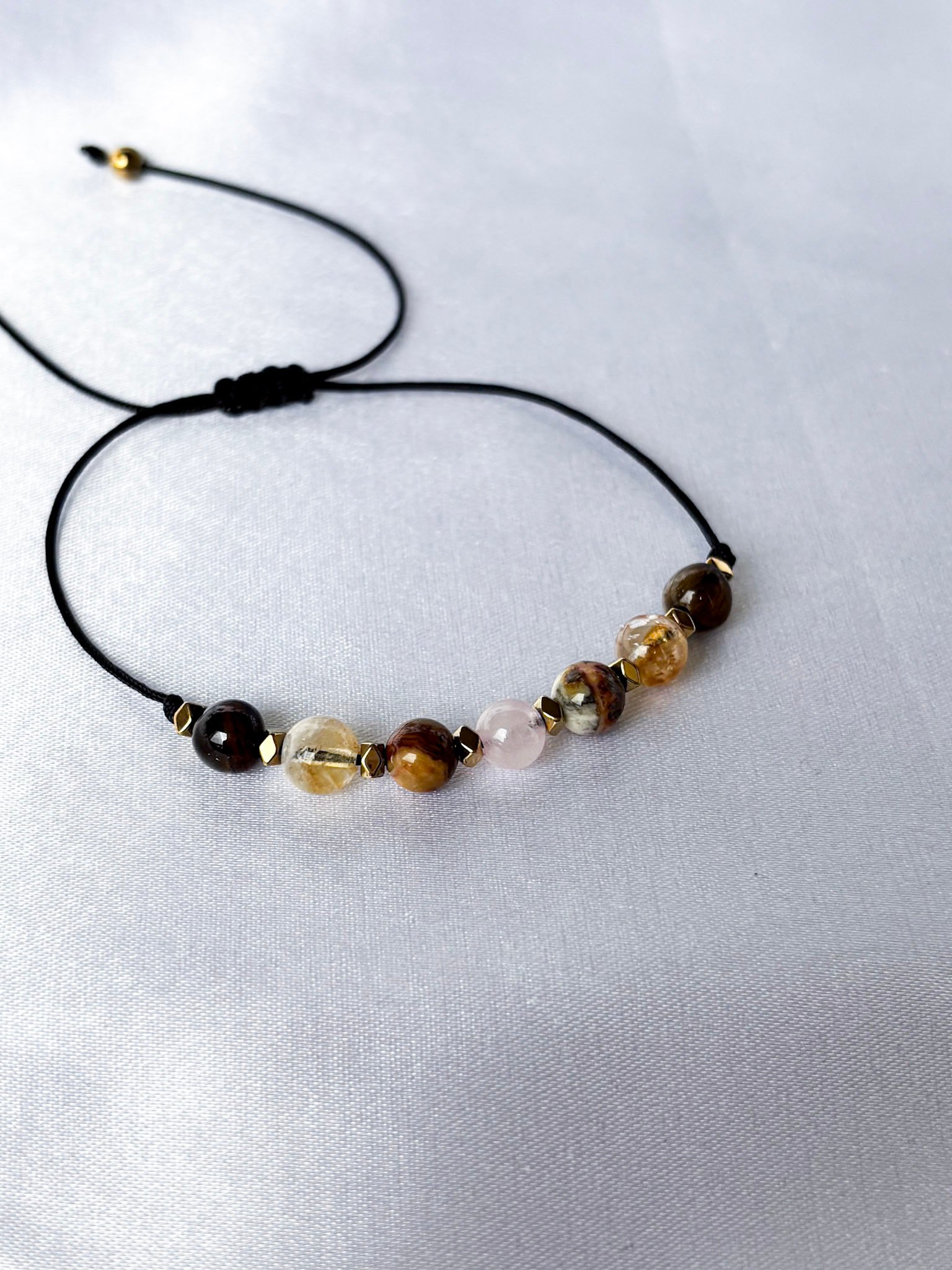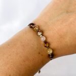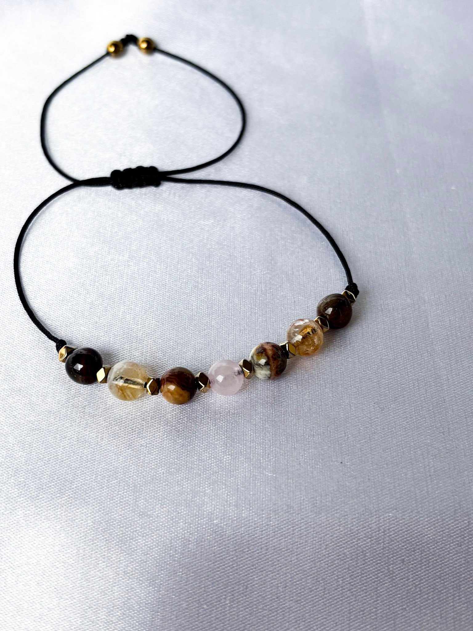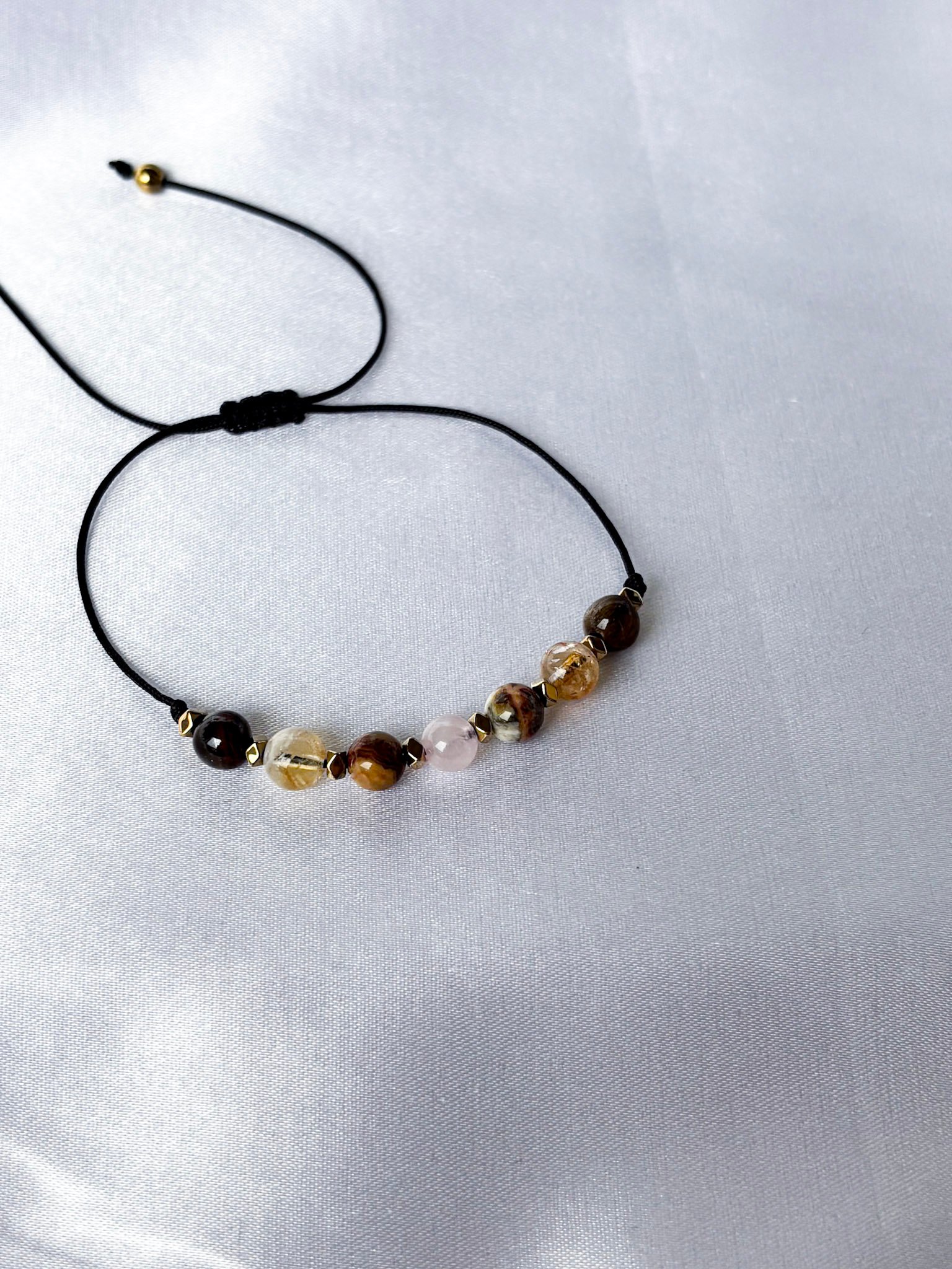 Unikalna bransoletka wykonana z kamieni naturalnych. Jeśli któregoś z kamieni akurat brakuje, może zostać zastąpiony tym samym minerałem, jednak o nieco innym odcieniu lub kształcie – każdy egzemplarz jest więc jedyny w swoim rodzaju. Warto mieć to na uwadze, bo natura lubi zaskakiwać 🌿