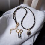 Przenieś się do świata magii i tajemnicy z naszym wyjątkowym naszyjnikiem „Noc Kairu”. W centrum uwagi znajduje się elegancka zawieszka z Lapis lazuli, symbolem mądrości i wewnętrznej harmonii. Towarzyszy jej lśniący hematyt, który według wierzeń dodaje siły i odwagi. Całość dopełnia noc Kairu – kamień o głębokim granatowym odcieniu z milionem mikroskopijnych iskier, jak rozgwieżdżone niebo.