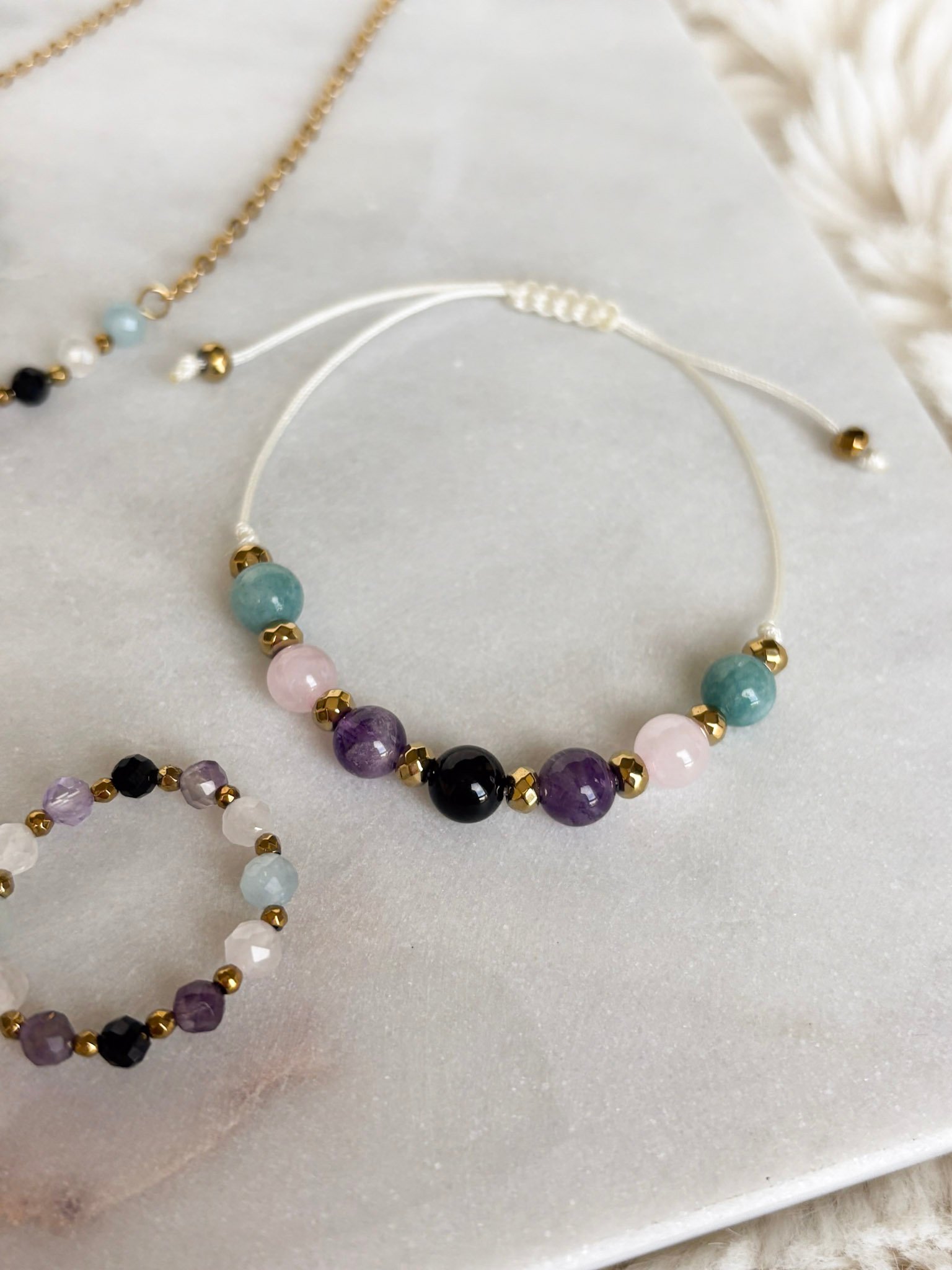 Unikalna bransoletka wykonana z kamieni naturalnych. Jeśli któregoś z kamieni akurat brakuje, może zostać zastąpiony tym samym minerałem, jednak o nieco innym odcieniu lub kształcie.