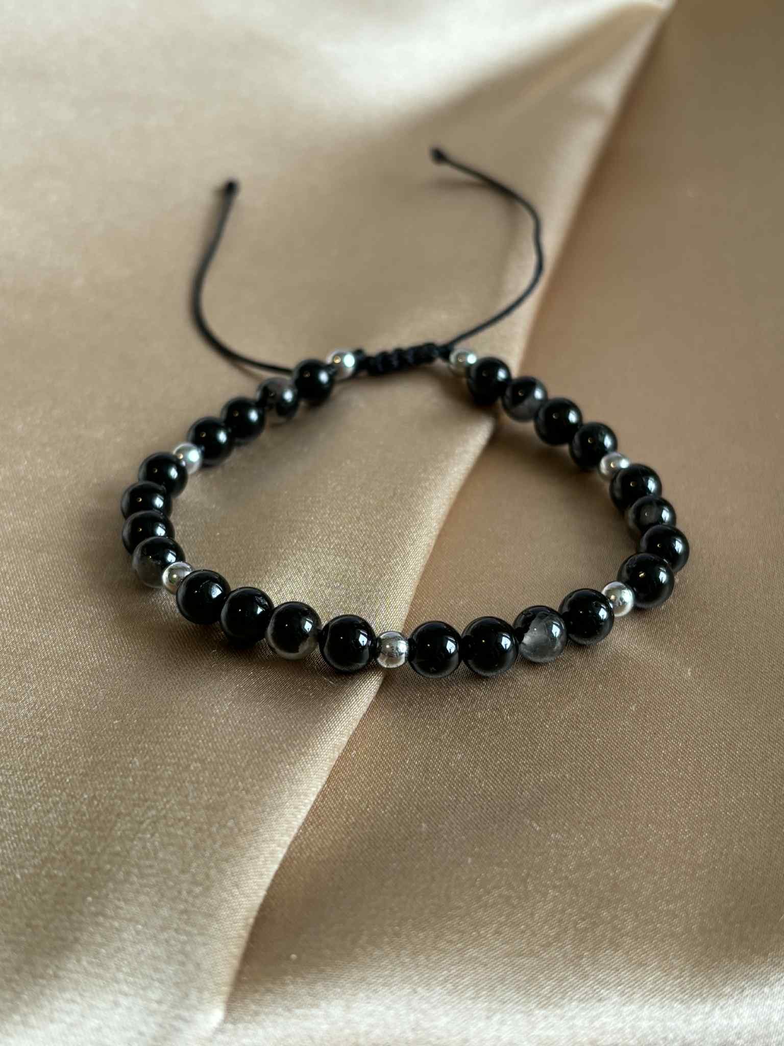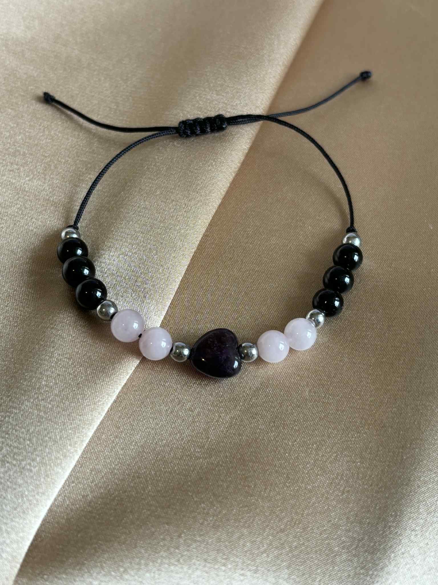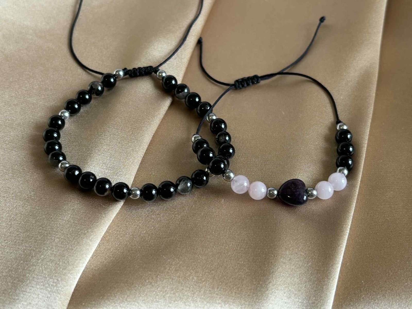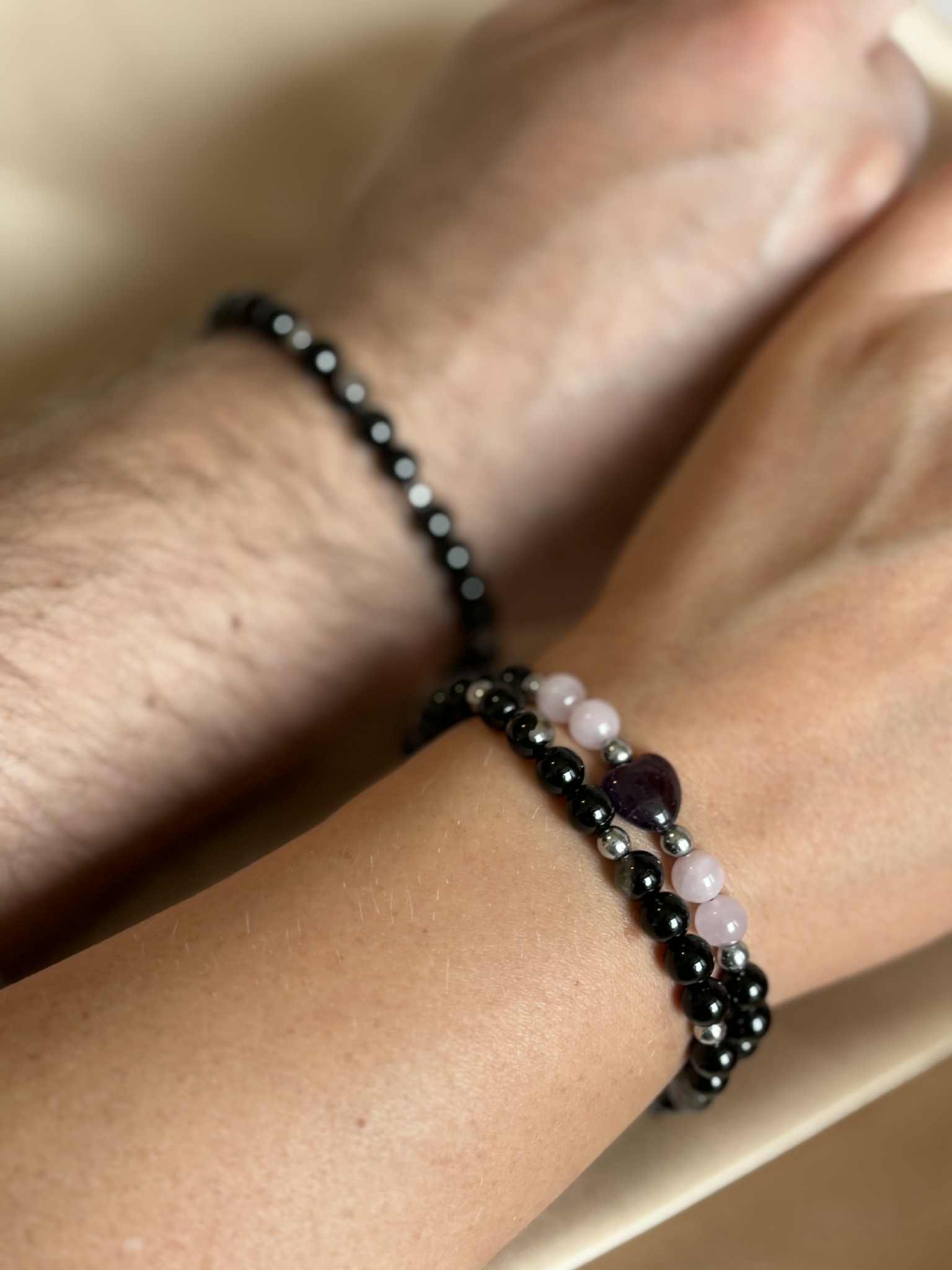 Oferta dotyczy 3 sztuk. Dwie klasyczne z czarnym turmalinem, dodatki złote lub srebrne hematyty (proszę wybrać) oraz jedna, damska z mniejszą ilością turmalinu, ale z dodatkami kwarcu różowego i serduszka ametystu.